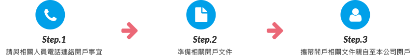 | 法人 | 請附上公司設立(變更)登記事項表影本、公司設立登記證明文件或公司執照影本、公司負責人身份證影本、及往來銀行存摺影本、集保存摺影、FATCA辨識身分相關證明文件 |